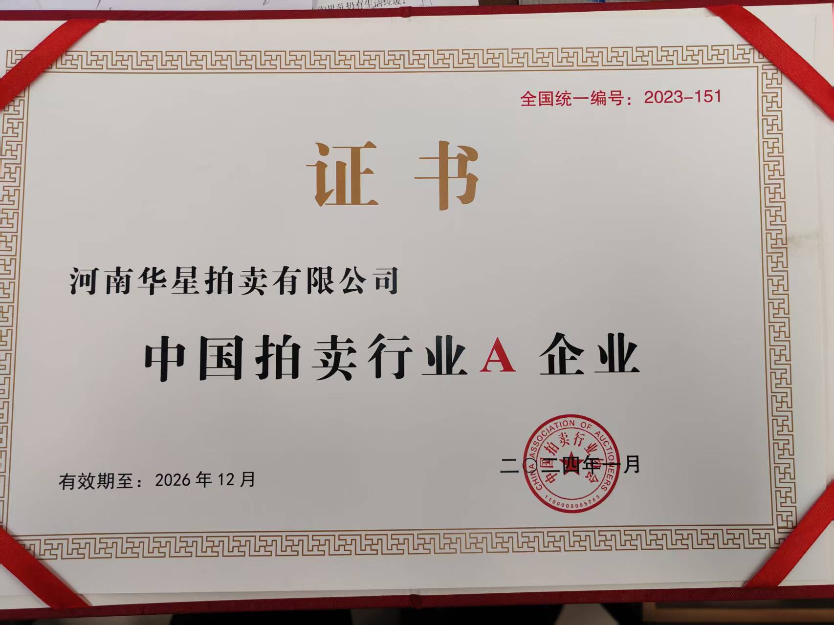 2023年12月我公司經(jīng)中拍協(xié)全國(guó)拍賣企業(yè)等級(jí)評(píng)估工作辦公室評(píng)為A級(jí)企業(yè)